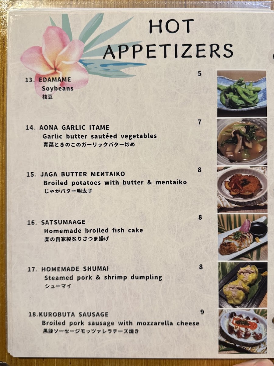 The menu items are suitable for casual dining occasions ranging from light meals and snacks to fuller dinners. The variety allows for quick orders of small plates as well as more involved meals focusing on sushi and sashimi. Beverages include nonalcoholic options complementing the food selection.
